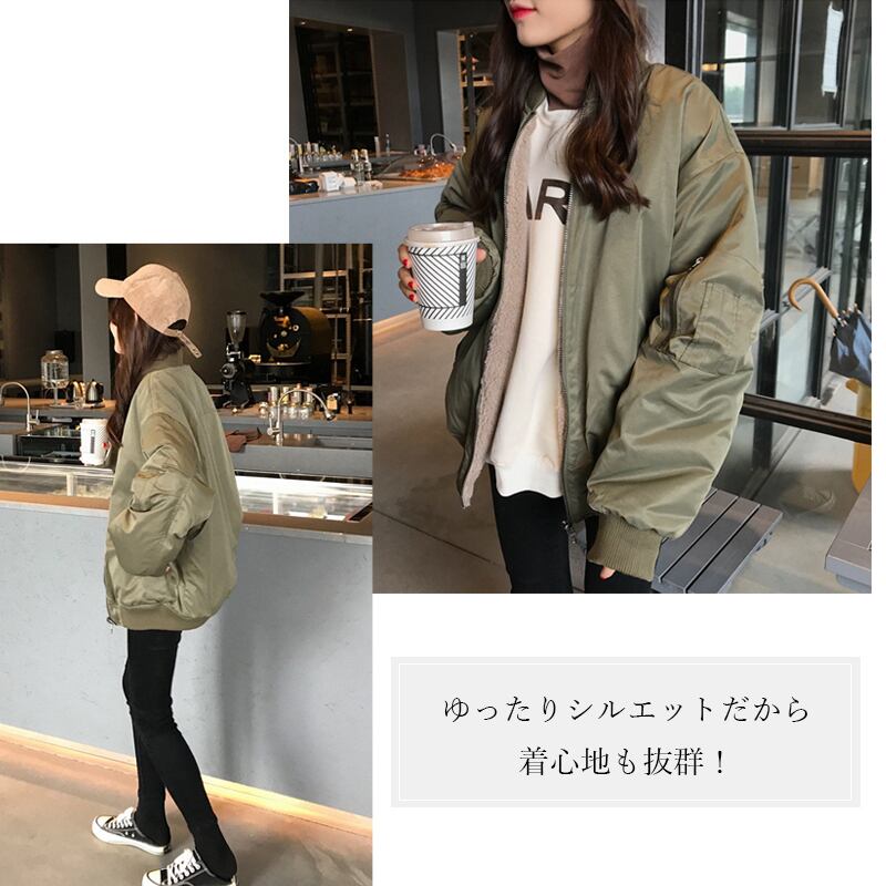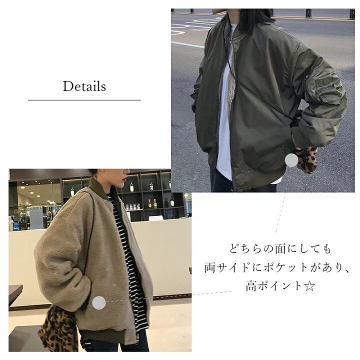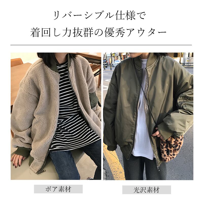 【大人気】【リバーシブル】シンプルなデザインながらボアの総柄のインパクトが◎♪ リバーシブルなので着回し抜群◎♪ ジャケット ブルゾン ボアジャケット 長袖 無地 カジュアル アウター ライトアウター ポケット ボア リバーシブル MA1