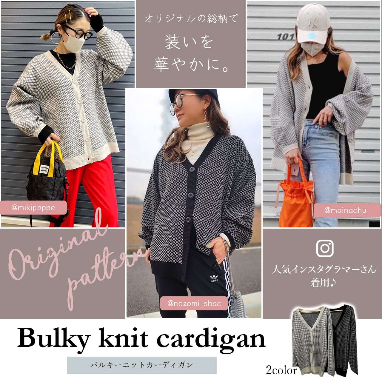 【2カラー フリーサイズ】12Gバルキー総柄ジャガード チュニックカーディガン♪